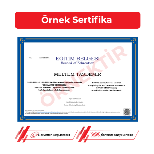 Üniversite Onaylı Sertifika: Otomasyon sistemleri destek elemanı kursu online eğitim programının ardından yine online olarak gerçekleştirilen sertifika sınavında en az 45 puan alarak başarılı olan kursiyerler üniversite onaylı sertifika almaya hak kazanırlar. Otomasyon sistemleri destek elemanı sertifikası, farklı birçok sektörde profesyonel çalışmalar yapmaya olanak tanır.