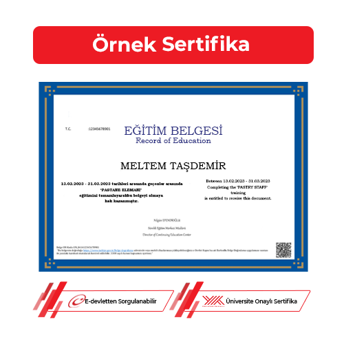 Sertifika, bireyin pastanede üretim işleri yapabileceğini gösterir. Online pastane elemanı kursunu başarıyla tamamlayanlara verilen sertifika üniversite onaylıdır. e-Devlet üzerinde görüntülenebilmesi sertifikaya resmi evrak niteliği kazandırır. Ömür boyu sertifikası olanlar, pastanede çalışabilir.